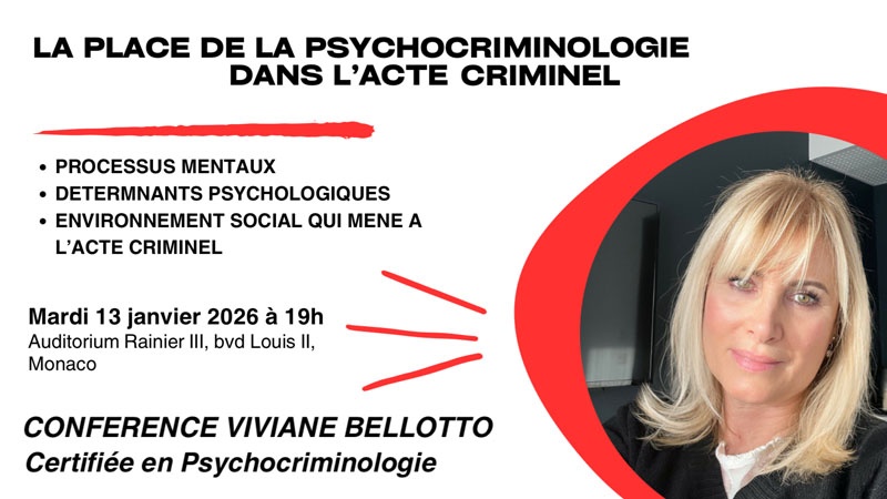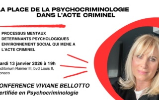 L’association Femme Leaders Mondiales Monaco vous propose une conférence par Viviane BELLOTTO, certifiée en psychocriminologie. "La place de le psychocriminologie dans l'acte criminel" Processus mentaux Déterminants psychologiques Environnement social [...]