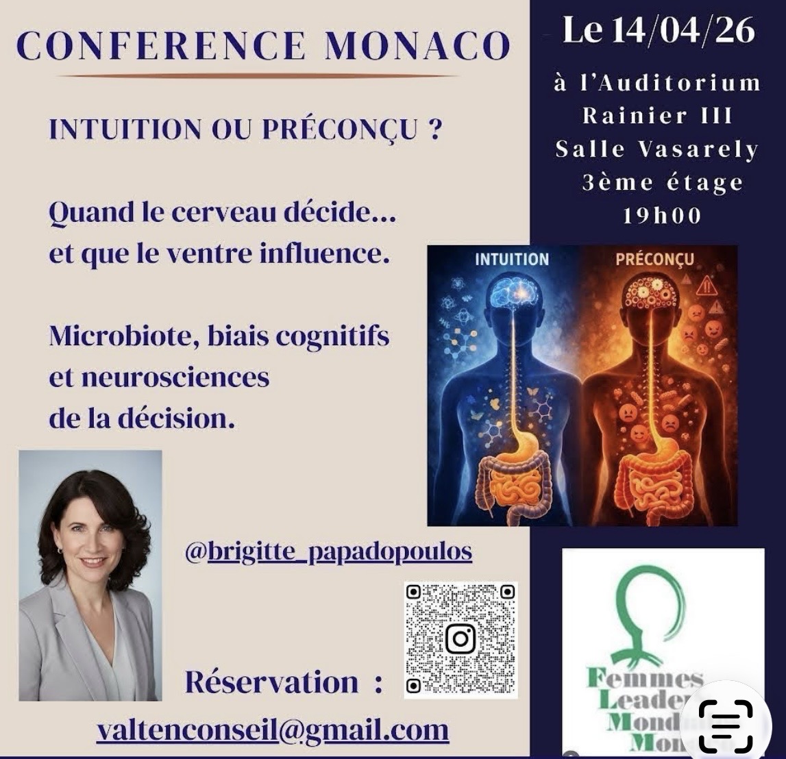 Organisée le 14 avril 2026 à 19h00, à l’Auditorium Rainier III, Salle Vasarely (3ème étage), cette rencontre a rassemblé un public intéressé par les liens entre fonctionnement cérébral et signaux corporels. Le sujet, à la croisée de plusieurs disciplines, invite à mieux comprendre la manière dont intuition et conditionnements interviennent dans la prise de décision.